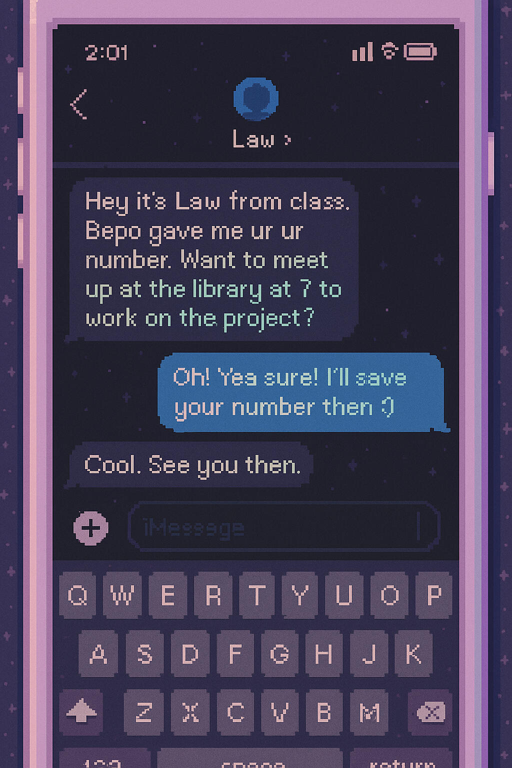 Well...There is this ONE guy...His name is law. We have biology class together and we were paired up in a small group project together. He's cute and the project was fun, but I haven't talked to him sense we finished it...